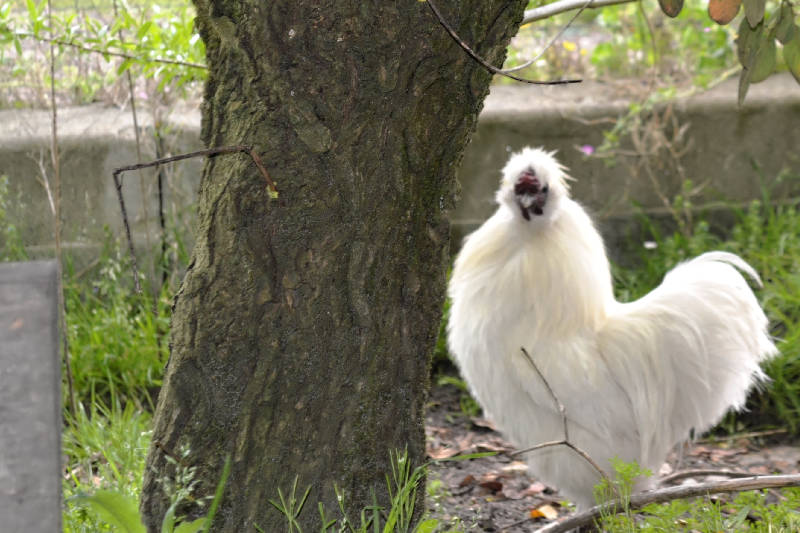 J'aurai fait la mise au point sur le coq, car du coup l’œil est plus attiré par l'arbre qui est net, et j'aurai essayé de cadrer de manière à ce que le mur à gauche n'apparaisse pas.