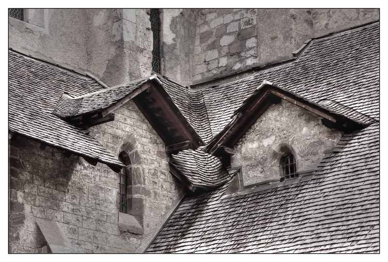 Joli détail d'architecture. L'image aurait plus d'impact si on pouvait augmenter le contraste entre les toitures et les murs de pierres.