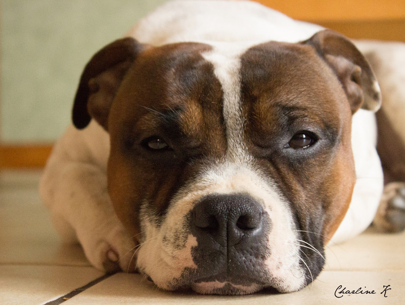 Il a une bonne bouille ton chien, et c'est super que tu te sois mis à son niveau pour le prendre en photo J'ai l'impression que la mise au point a été faite sur la truffe, essaies la prochaine fois de la faire sur l'oeil, sur un humain ou un animal c'est la première chose que l'on regarde, les yeux !