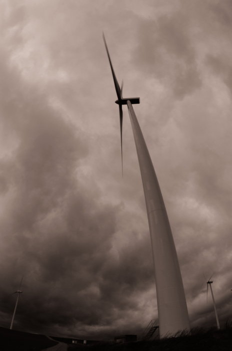 Belle prise de vue, un peu sombre quand même. Peut-être que le fond noir de cp y est pour quelque chose. Le ciel est bien cadré avec les nuages sombres qui semblent se précipiter vers l'éolienne. J'aime beaucoup