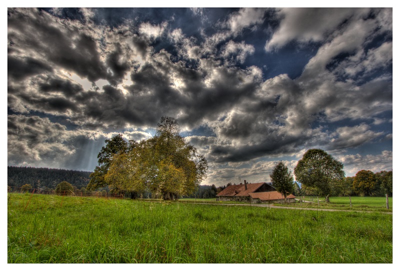 Un joli paysage bucolique. Tout comme JM54,le traitement style "HDR" est très poussé. Les nuages sont bordés de noirs et donnent un côté non réel. J'aurai,je crois vu un traitement tout en finesse pour ce genre de paysage ou les arbres sont comme de la dentelle.