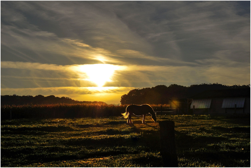Belles couleurs. Les courbes du cheval sont soulignées par le soleil L'image est un peu sombre mais lisible : l'herbe, le champ de céréales. Le bosquet d'arbres un peu moins (mais je me méfie car mon écran est mal réglé pour les noirs. J'en ai fait l'expérience sur ton village corse )Le ciel mérite la place que tu lui as laissée dans la compo