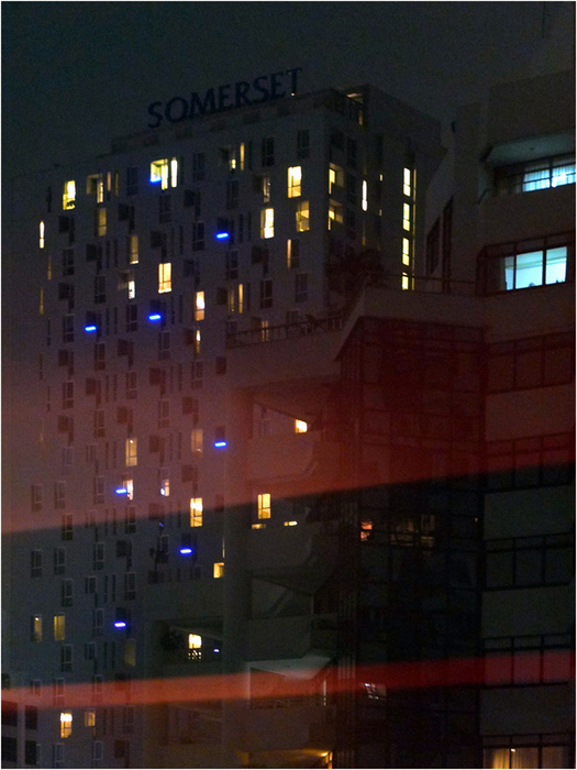 Cet immeuble illuminé, ce noir et ce rouge me font penser à un paquebot au milieu de la nuit