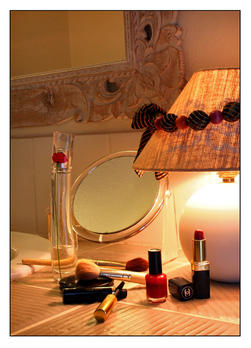 On a déjà deux couleurs qui symbolisent la Femme : noir et rouge. Plus une marque connue, la rose rouge, le miroir -mon beau miroir - et les outils de beauté.