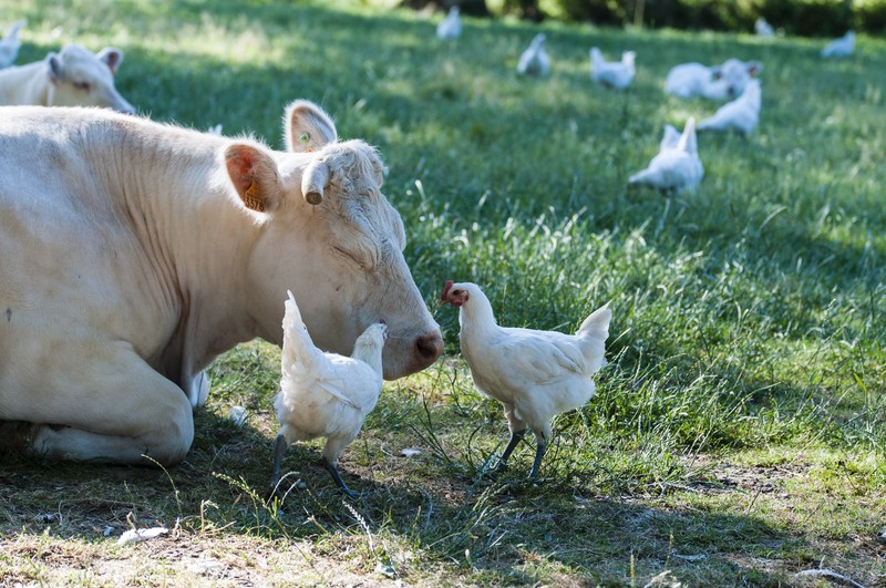 Recadrer plus serré, voire même en carré (qu'il ne reste que la vache et les deux poules)aurait donné plus d'impact à la photo.