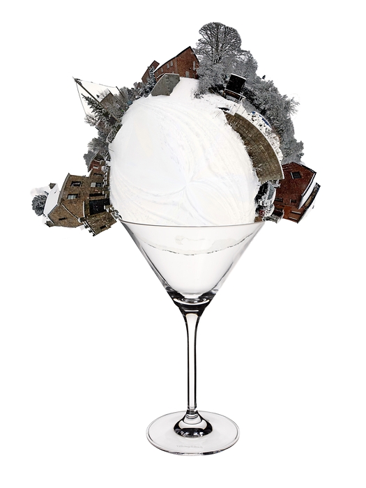 J'ai voulu tester la technique expliquée par Skatris sur ses photos de mini globes. Ma rue était enneigée les jours derniers. J'en ai profité pour faire un pano photoshopisé pour ce cocktail improvisé