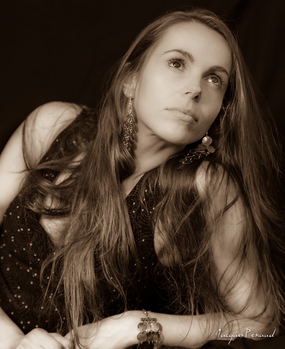 Beau portrait en triangle ++++ Dans cette composition, le regard vers le haut ne me gêne pas. Dommage pour les mains. Je ne suis pas sûr pour le léger sepia?