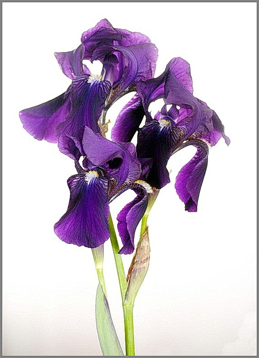 Le traitement sur ces iris me plaît, attention toutefois aux contours car ton travail sur le fond blanc fait apparaître de la "pixelisation"...