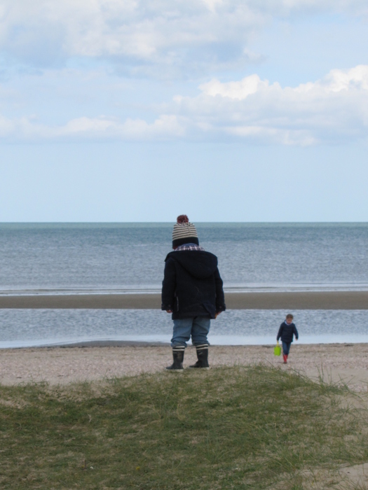 Il a fallu que je prenne cette photo assez vite et oui, la netteté n'est pas au top.. Ce qui m'a plu c'est l'alignement: limite bonnet/pompon et horizon, bras de mer et manches, bottes et sable etc... Et le rapport de tailles, évidemment! bon, il faut que je travaille la précision de l'image, c'est sûr!