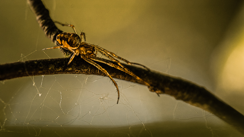 J'aime bien les différentes nuances de marron qui donne un côté "sombre" et un peu menaçant de l'araignée avec en plus cette toile sous la branche.