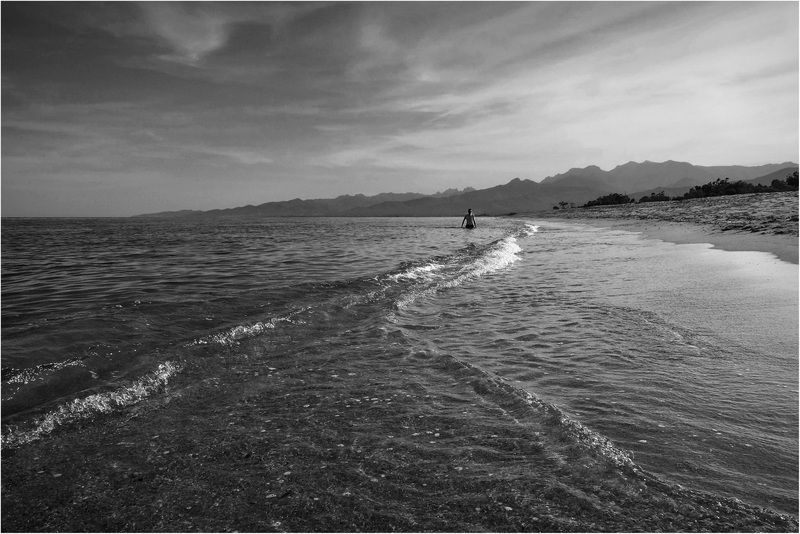 Une diagonale créée par la vague qui conduit au personnage (un peu petit peut être ??) bien vu, la lumière et N&B bien gérés