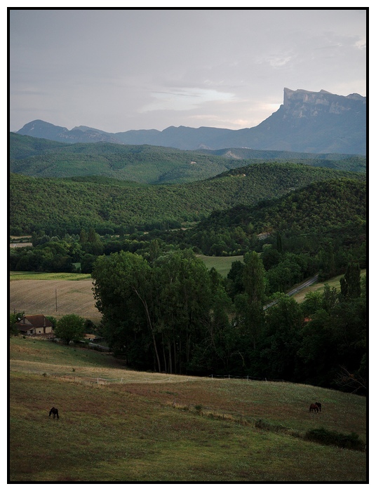 Beau paysage. L'oeil ne se dirige pas tout de suite vers les chevaux, en bas, aui apportent un peu de vie à cette image. Photo bien réussie.