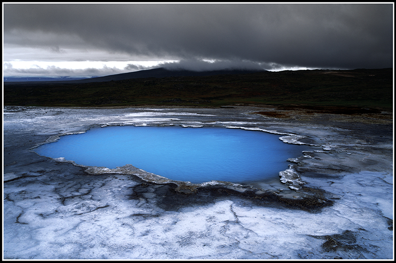Ce petit lac fait plus de 100 degrés et son diamètre env. 4 mètres. La couleur bleue malgré le ciel couvert est normale…l'eau est très chargée en silice et cette couleur vient de la diffraction de la lumière sur les particules de silice….
