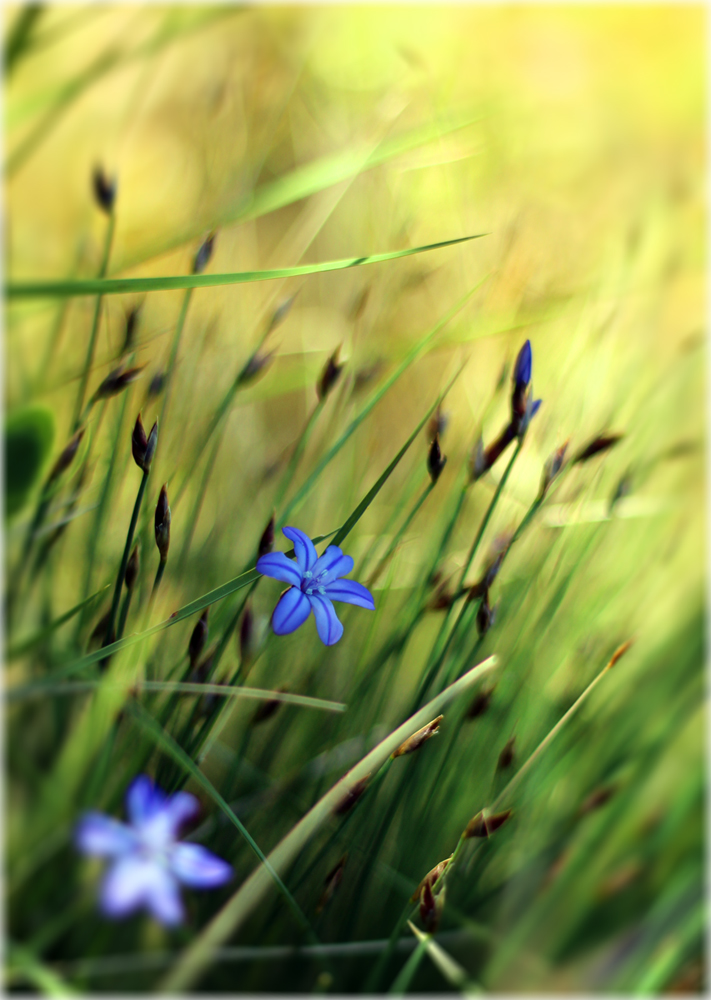 Je trouve la diagonale de points bleus agréable. Les couleurs et le dégradé du bokeh également. Le piqué du sujet un peu juste p-être et le blanc de celle de l'AVP trop lumineux. (surtout qu'elle se détache bien sur le fond sombre).