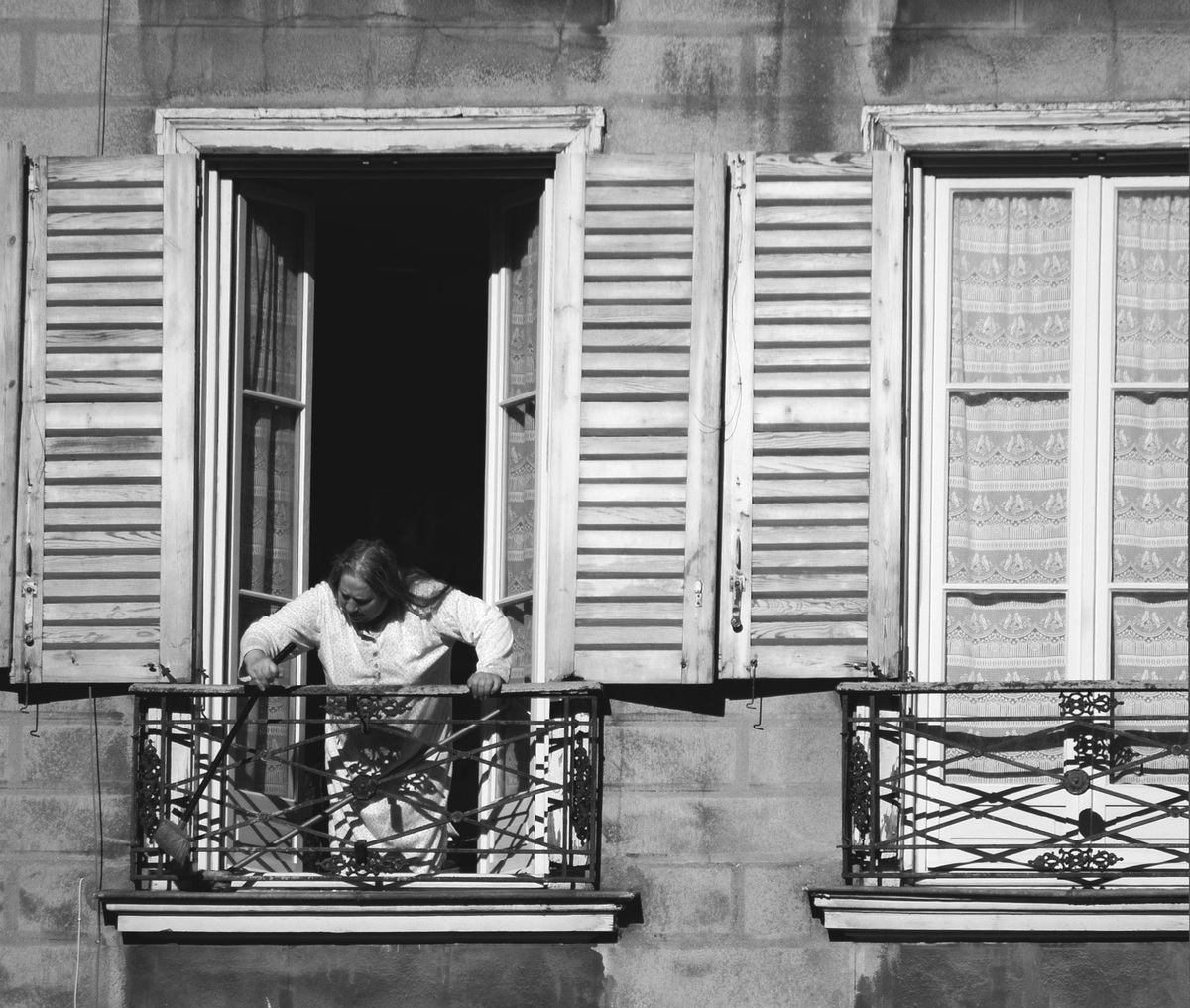 Pas trop emballé par cette photo...je vois juste une femme qui nettoie son balcon...désolé...