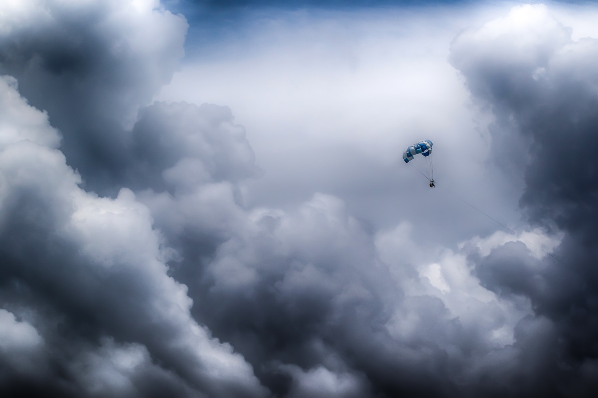 Il a l'air bien perdu dans tous ces nuages menaçants Je n'arrive pas à définir s'il s'agit de vol à voile ou d'autre chose mais le fil qui y est rattaché réduit le coté dramatique, dommage, mais la photo n'en est pas moins marquante