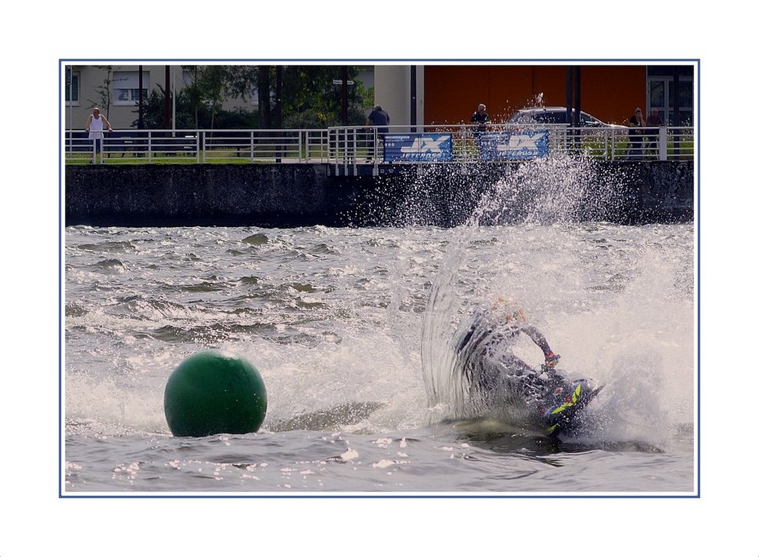 La gerbe d'eau est effectivement bien saisie, mais je trouve l'arrière-plan vraiment trop présent : les barrières, la voiture, les spectateurs/passants, et surtout ces deux gros panneaux bleu... nous détournent du sujet et n'apportent rien à l'image.