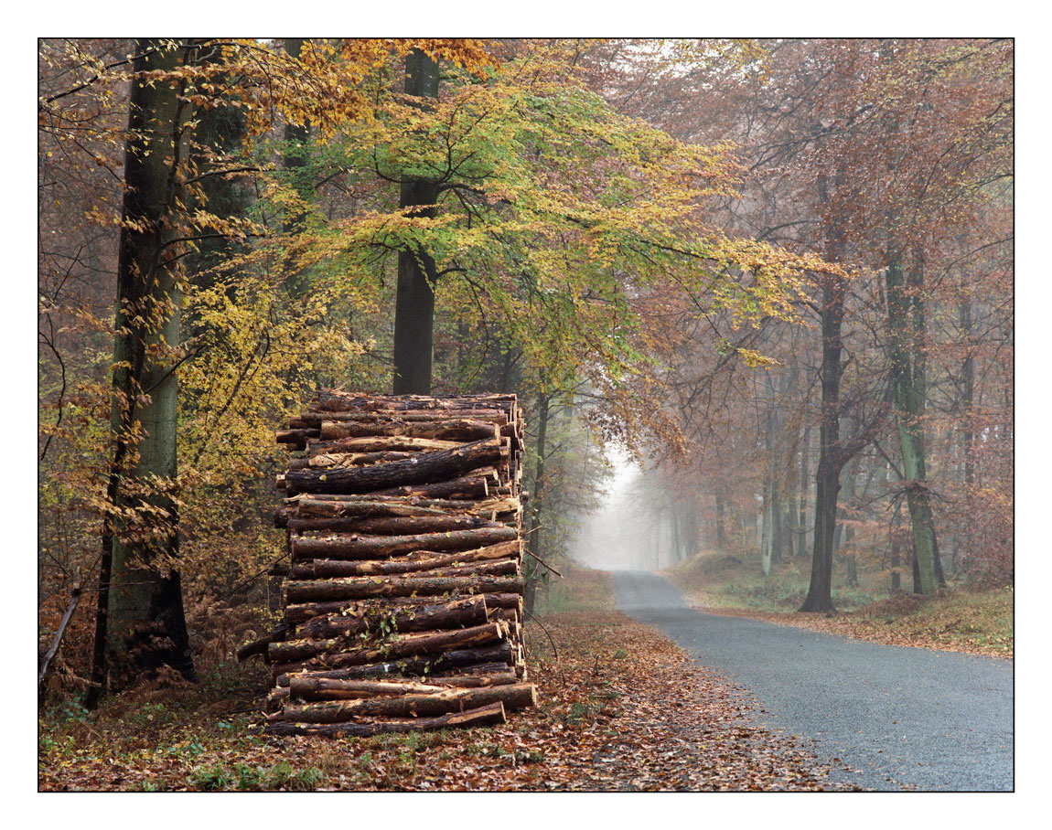 Très réussie,à la lecture on plonge direct sur le tas de bois bien net ,couleurs saturées comme j'aime et la cerise sur le gâteau la brume est là juste un petit regret pour ce chemin goudronné.