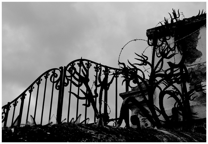 insécurité et danger. Pics de verre et barbelés, interdiction d'entrée. J'aime bien le sujet et l'atmosphère qui se dégage. Un peu fouilli néanmoins, mais le message passe pour moi.