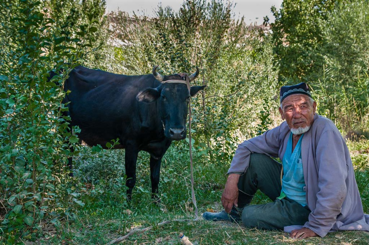 souvenir de voyage. Une vache, un homme.