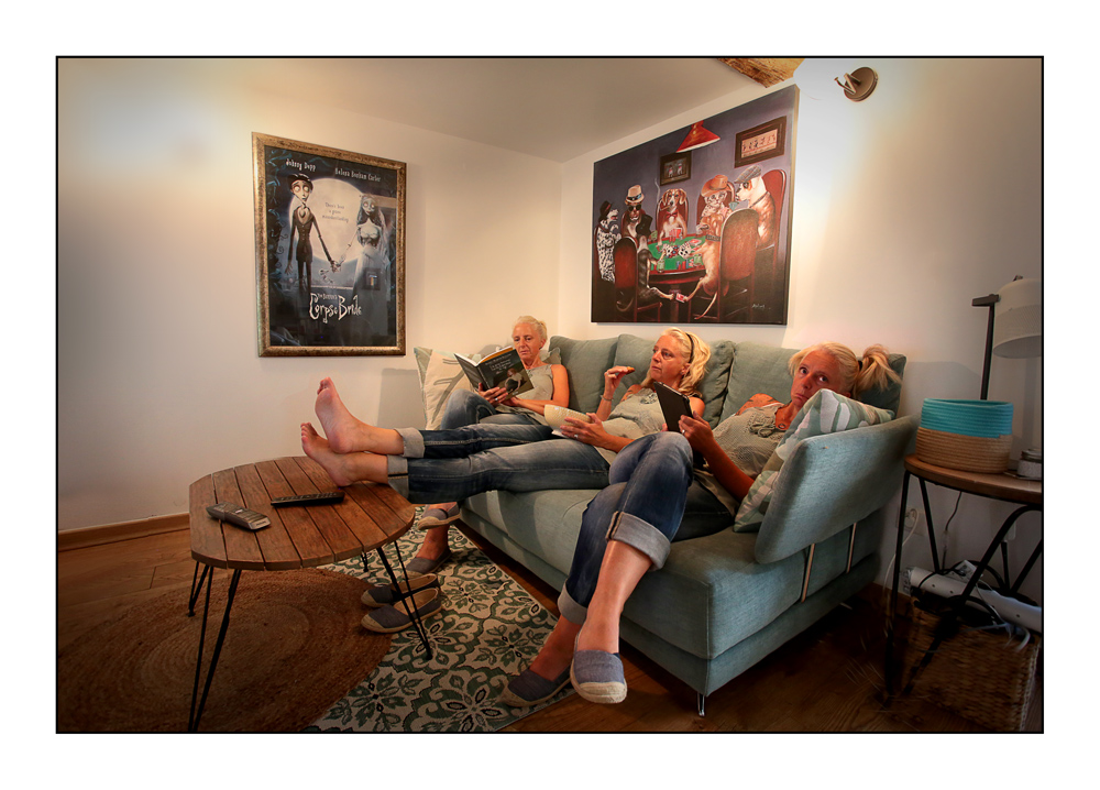 L'idée me parait bonne, trois soeurs probablement... Habillées de façon coordonnée, ensemble mais chacune avec son activité