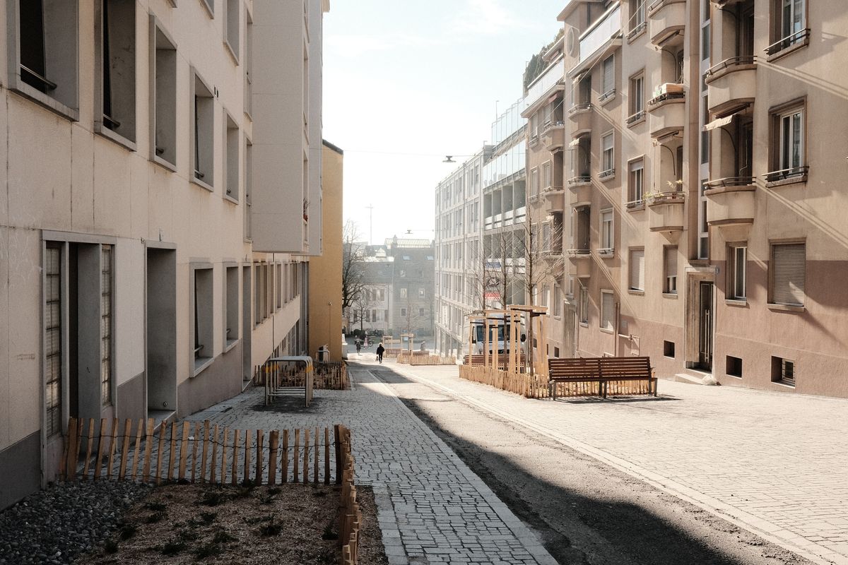 Du béton du béton et encore du béton, un petit manque de charme. C'est la ville c'est ainsi des perpendiculaires, des horizontales et peu de courbes pour adoucir l'espace.