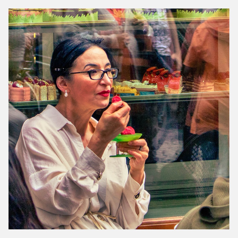 Mais j'aime bien l'idée de l'instant de plaisir qui isole de la foule et de l'agitation qui se reflète dans la vitrine...