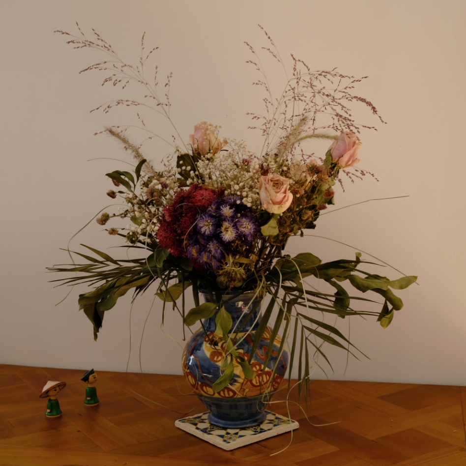 J'aime beaucoup ces herbes légères du bouquet qui viennent s'incruster sur le mur comme si elles en étaient le motif.