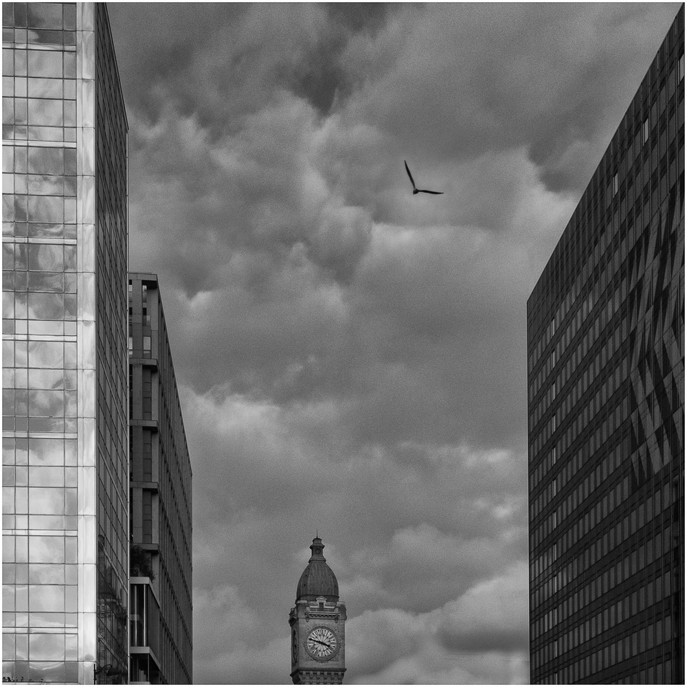 Il y a une Jolie gamme de gris ( un peu plus de blanc cependant sur le bâtiment ensoleillé ?) et une compo aux oignons … le clocher est magique dans cet environnement … bien vu 👏👏👏