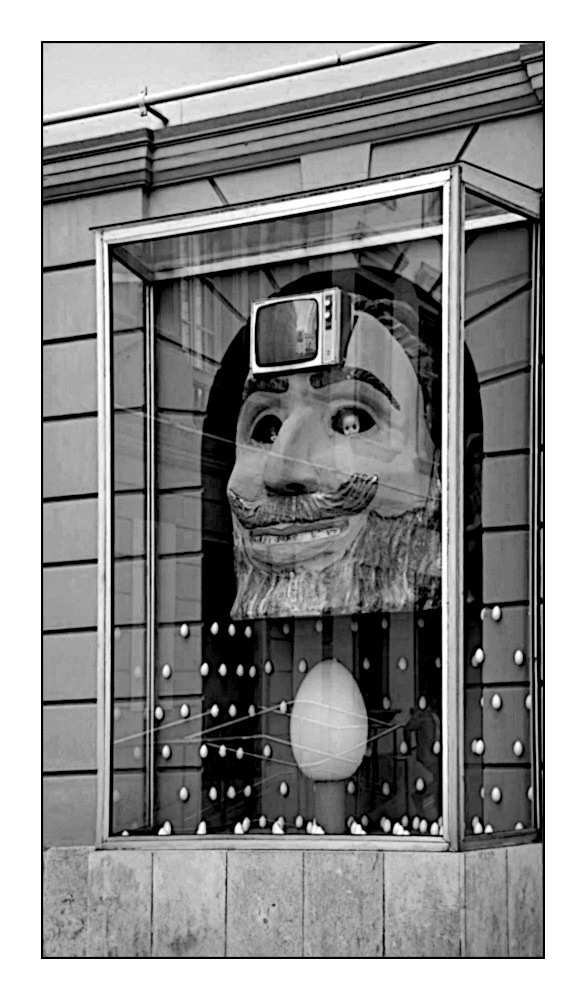 Scénographie dadaïste et surréaliste, ne plus regarder le monde à travers un écran mais plutôt avec nos yeux d'enfants. Juste la compo un peu serré bord cadre, peux ère n'avais tu pas le choix? Sinon beau coup d'oeil