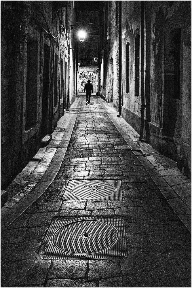 Nocturne et ruelle, belle gestion de la lumière, beau renďu des matières avec ces fontes et pavés. Même si cette rue semble sans issue, l'homme d'un pas décidé ne s'en soucis guère.