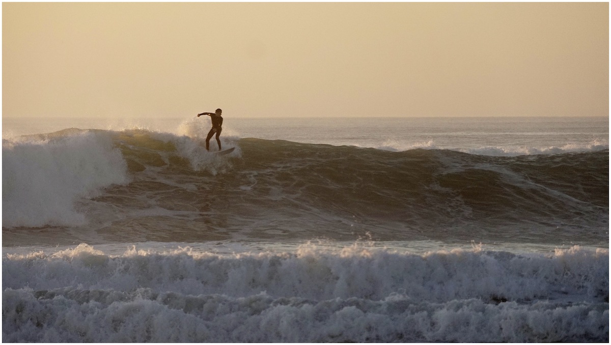 La lumière est belle et douce et joue sur les vagues et le surfer qui devient fourmi dans ce vaste océan.