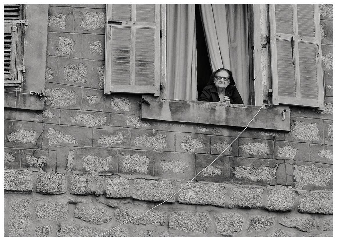 Tout est de travers, sauf le regard de cette dame, droit et franc, vers l'objectif du photographe