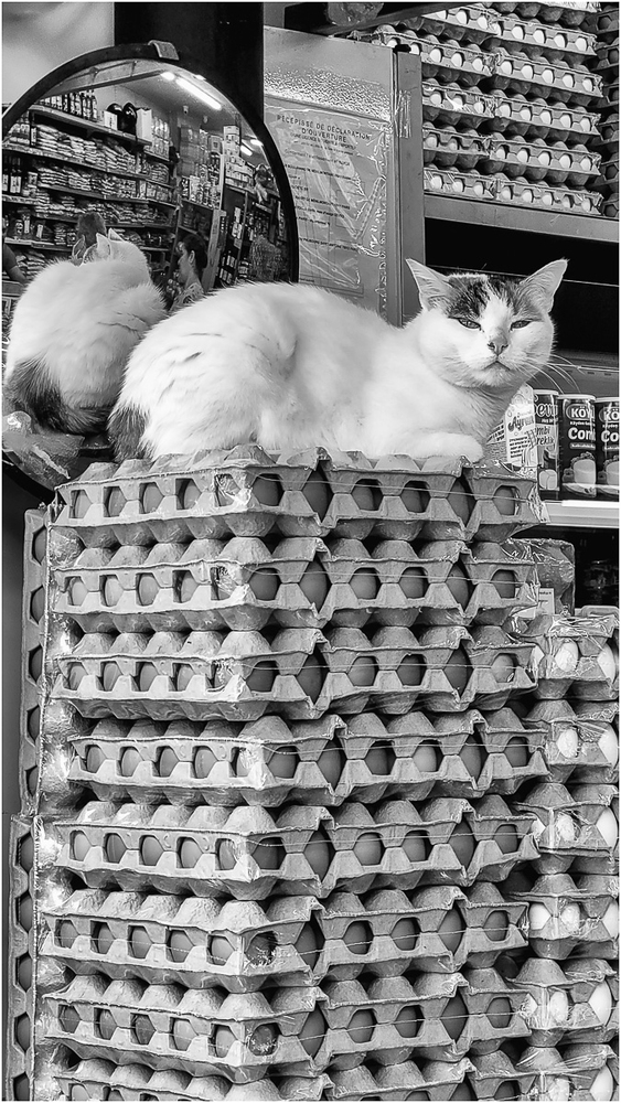 Ah ça, c'est pas courant, un chat perché sur des oeufs(ça n'allait pas avec "marcher", dommage).