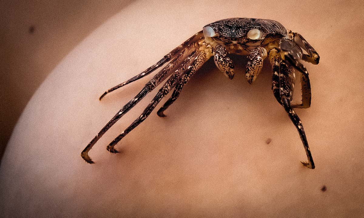 Comme pas de commentaire je tente une proposition : faire un carré en coupant carrément au milieu de la tête du crabe afin de ne garder que l'oeil gauche et les pattes en diagonale. On a un rappel avec le point de beauté à gauche. On peut éclaircir ensuite jouer sur les contrastes...Bon, ce sont mes délires hein, je tords souvent trop les photos.