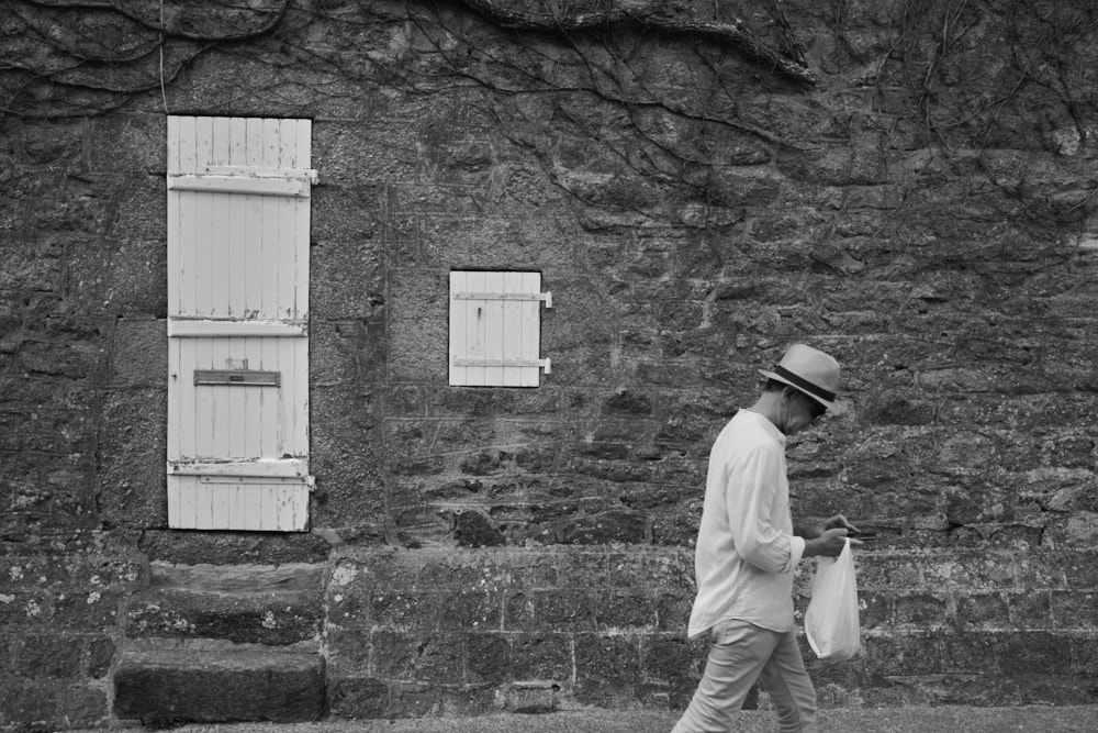 Toujours l'importance du tel portable, mais une fois l'observation de ce passant, beaucoup de détails avec ce mur, cette porte surélevée avec cette pierre comme promontoire, ce petit fenestron mai aussi ces branches ou bois même coupé qui ont un temps décoré ce mur. Un ensemble de blanc pour ce NB bien "habité" par cette composition.