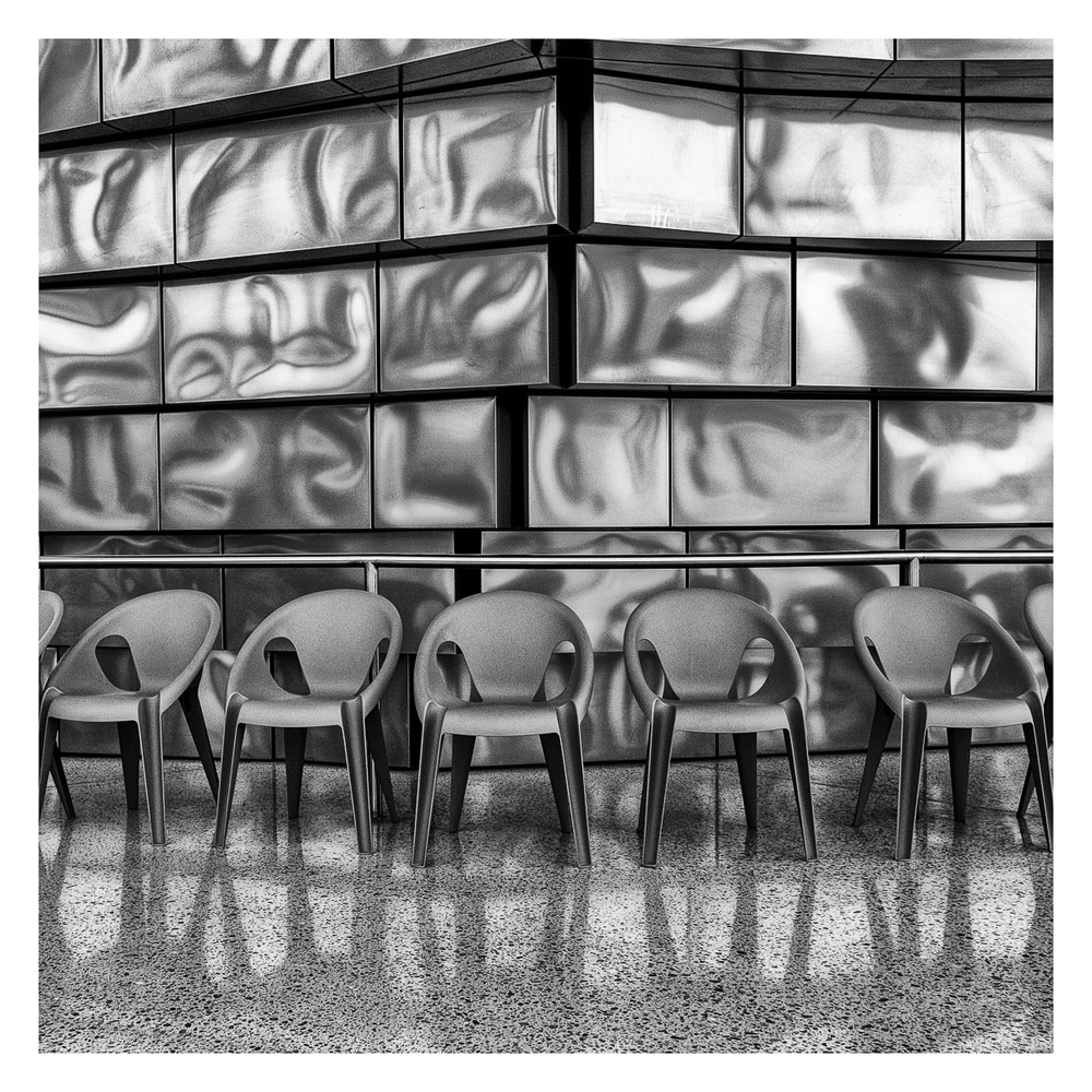 Une image dansante avec ces ondulations métalliques en arrière-plan et les jambes des chaises du premier-plan qui ne demandent qu'à suivre le mouvement.