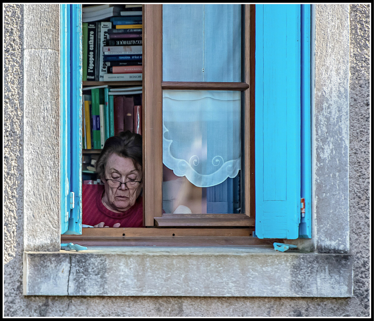 La verticalité du temps qui passe sur le visage de la dame et sur le bâtiment dont l'effet est remforcé par la bordure de la fenêtre et des volets repliés👌