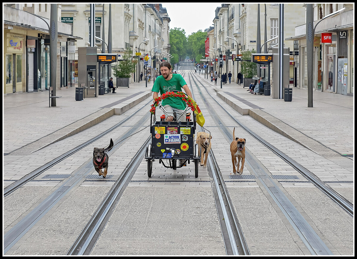 Bien vu également la symétrie des deux roues et des "deux fois quatre pattes" du premier plan qui se trouvent sur la même ligne.