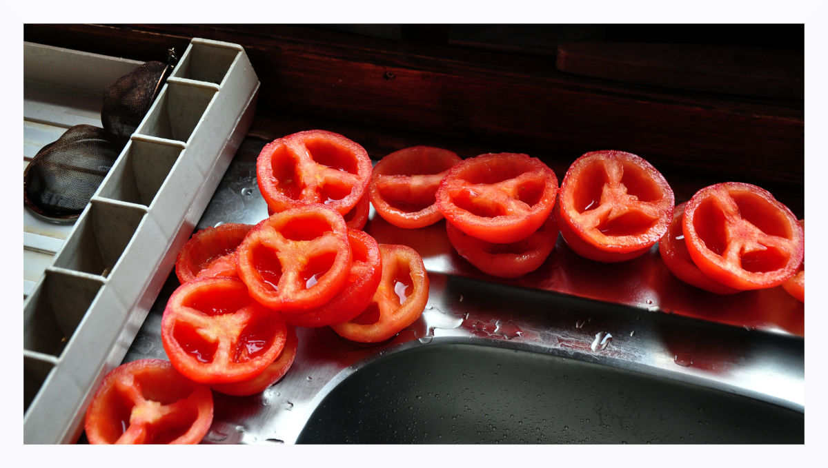 Un très bon cadrage qui met en valeur le côté graphique de l'intérieur de la tomate.