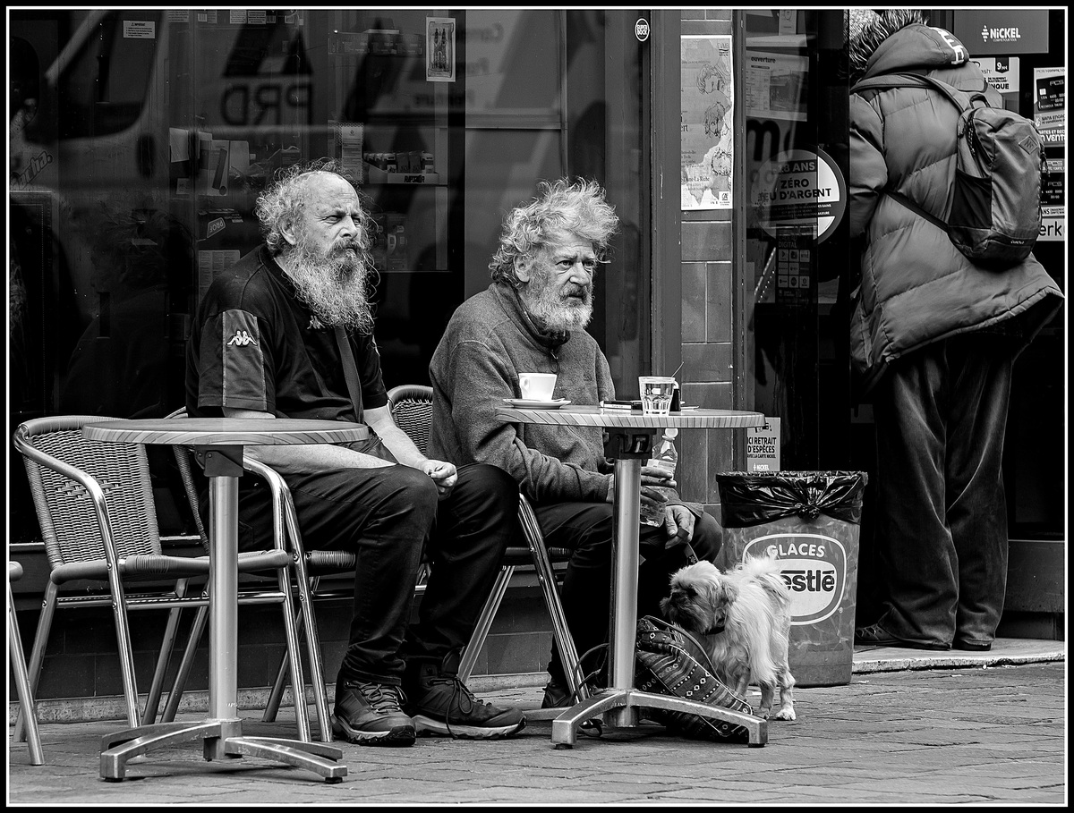 Impressionnants personnages, leurs scrutements sont en phase, ils sont littéralement absorbés .. Je me demande si on pourrait pas éliminer totalité ou partie de la personne de droite .. Beau N&B ..