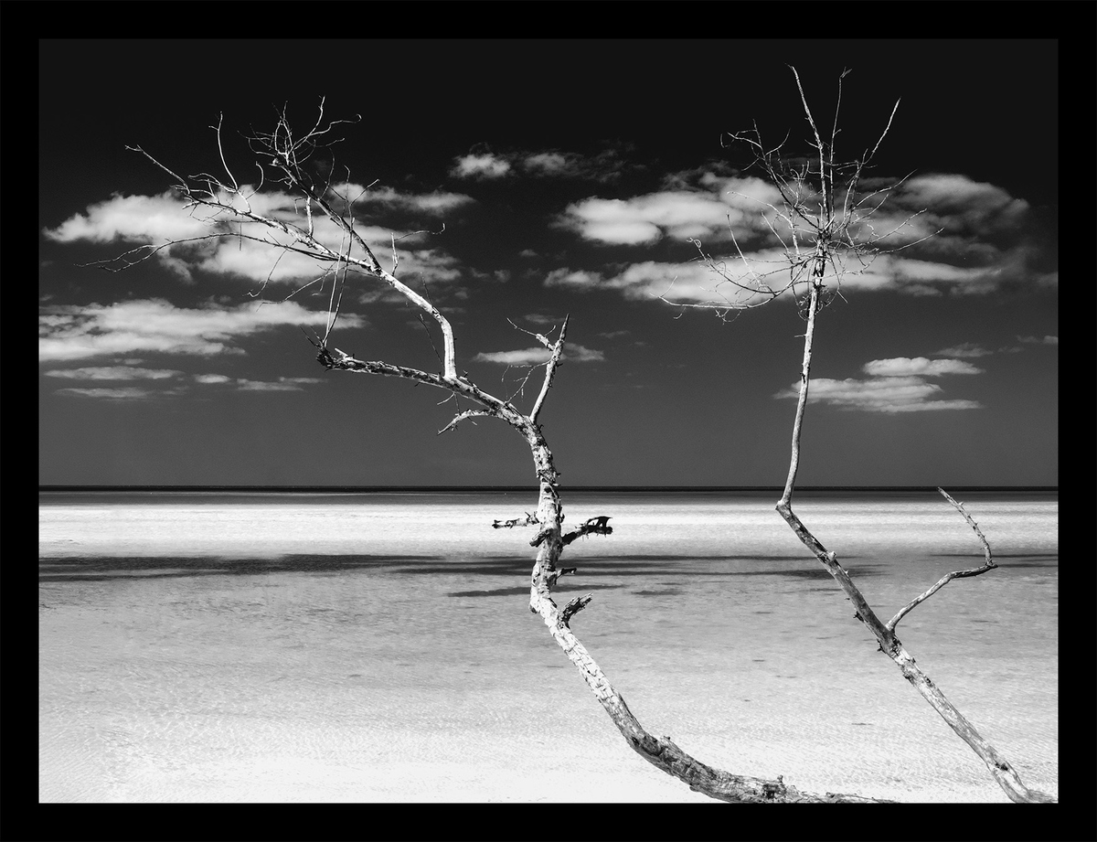 Un très beau n&b dans lequel les ombres planent à la surface de l'eau et les branches accrochent les nuages.