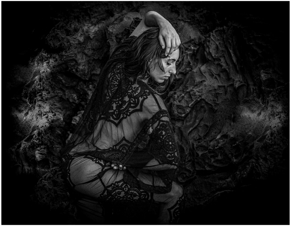 Les textures habillent de dentelles la roche en arrière-plan et la lumière capture la modèle dans une superbe pose.