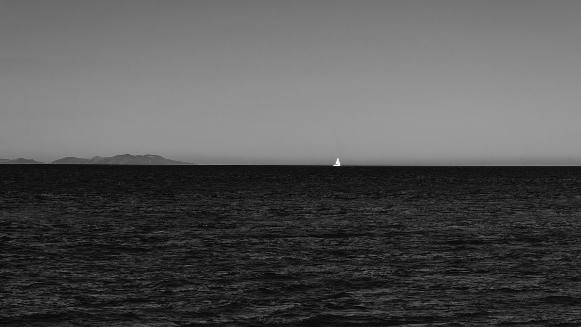J'aime bien ce minimalisme avec ces trois zones, grise ,noire et blanche jouant sur les lignes de centre ou presque pour le voilier.