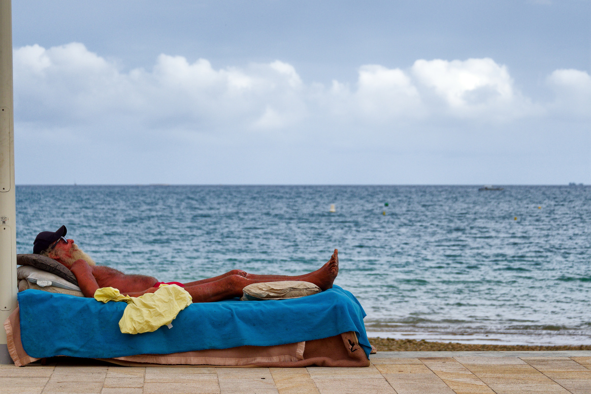 cet homme, inconnu, vit depuis trois ans sur la plage de l'Anse Vata à Nouméa. Avec sa valise, sa veste de costume, il vit ainsi, entre le bord de mer et la devanture d'un magasin vide.
