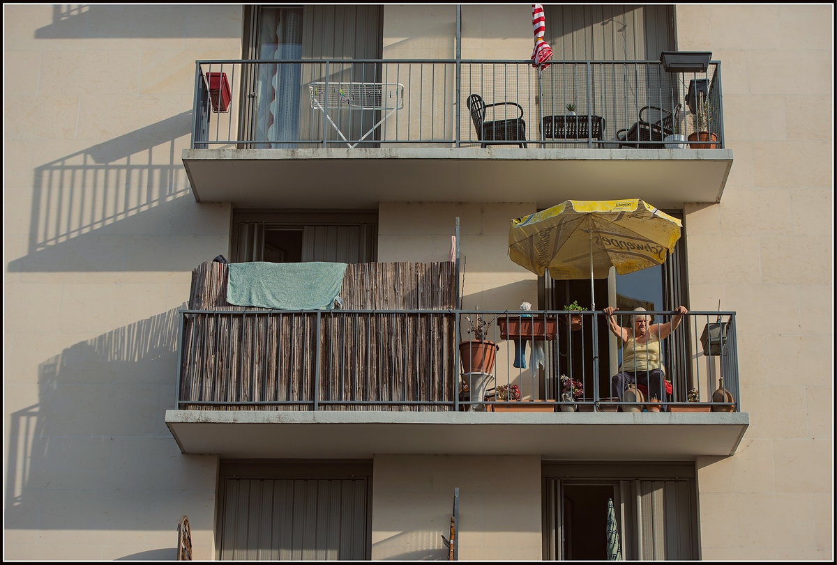 Sans savoir si cela serait mieux sans, le bas de l’image me gêne un peu. Je pense que tu as voulu conserver l’ombre. Je ne sais pas ce que j’aurais fait: j’aurais peut-être instinctivement cadré plus près du balcon (quitte à avoir celui du dessus) sans savoir si le résultat aurait été meilleur.