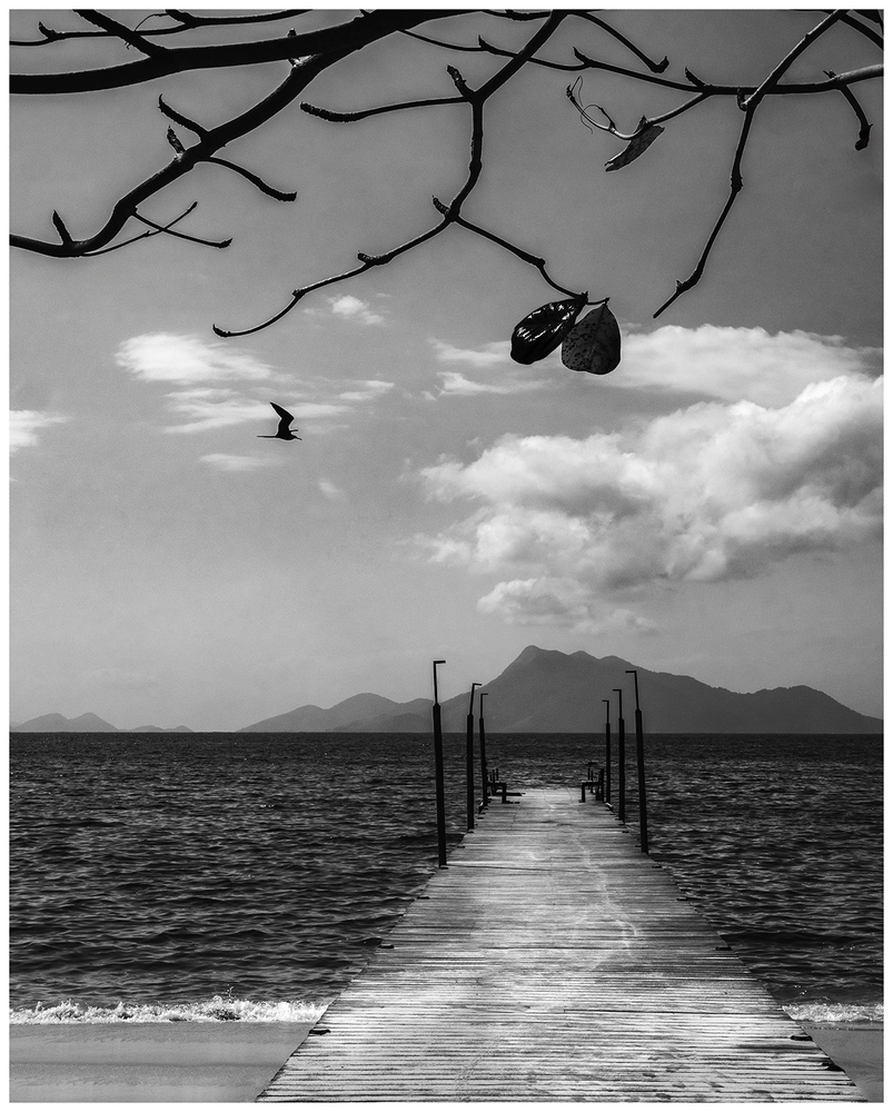 Hello Julgasaur ! Absolument magnifique, graphique et poétique, des horizontales, des verticales, un oiseau, un ciel chargé, un ponton, des bancs des lampadaires, des montagnes et les branches résurgences terrestres empiétant sur ciel, le tout servi par une belle lumière et un très joli NetB. Chapeau bas : favori. Tout petit bémol, j'ai l'impression que cela penchouille un poil à droite.