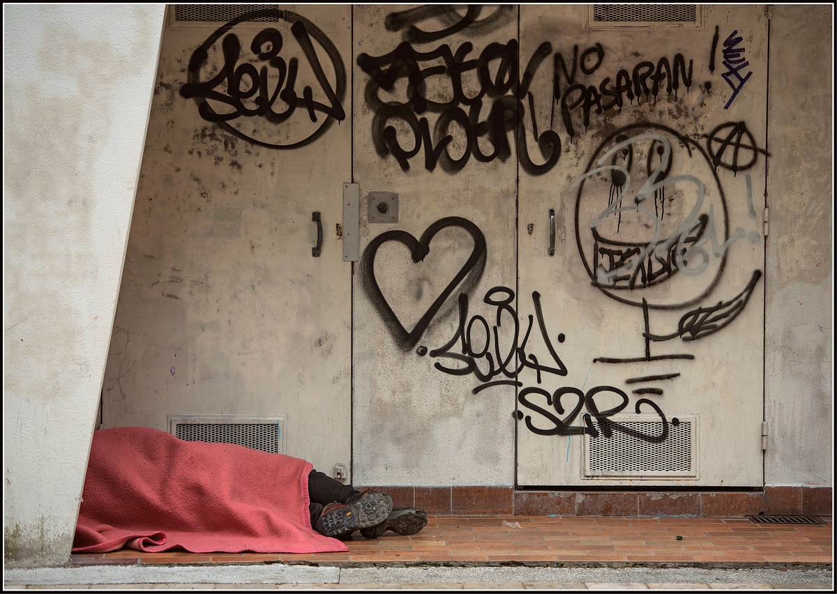 Quelle ironie: l'association d'un cœur et d'un homme squattant un abris.