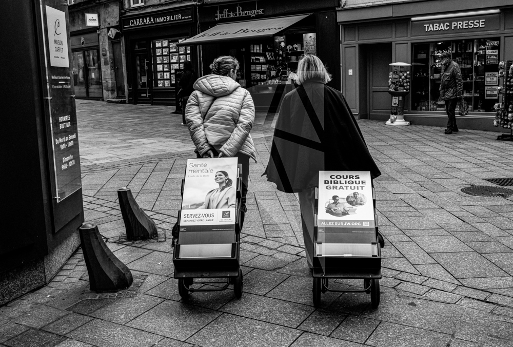 Jolie street, beau N&B, c'est pris dans une vitrine ? J'adore le "Cours biblique gratuit " ..