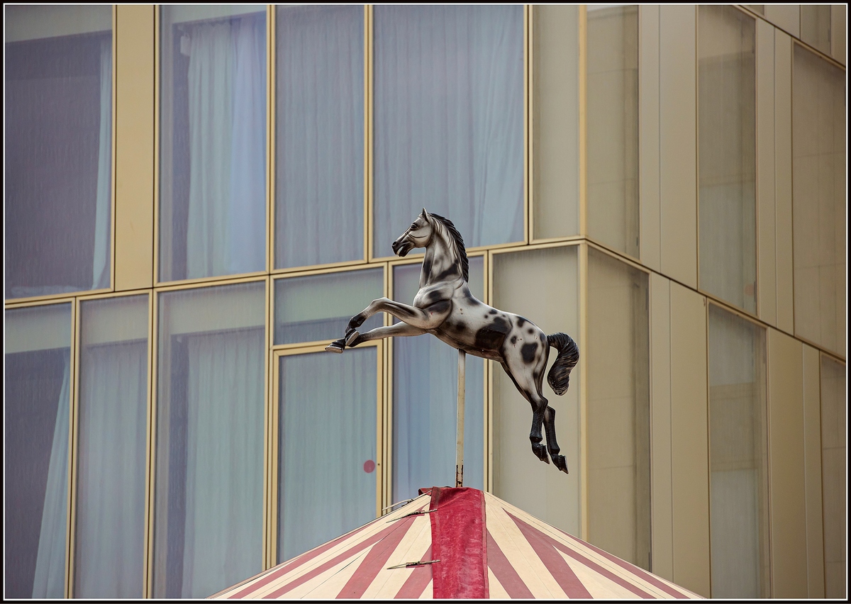 Trop centré pour moi. Il y a sûrement un cadrage à trouver avec les formes lignes des fenêtres, le haut du chapiteau et la position du cheval. Mais ce cadrage ne me parle pas désolé